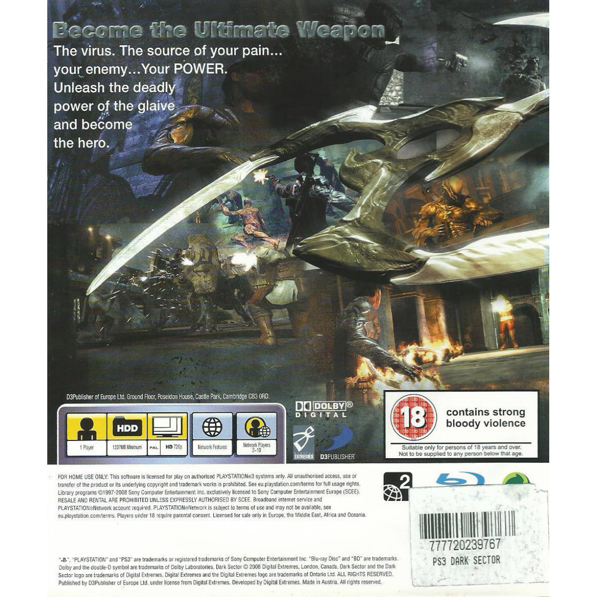 A Dark Sector főhőse egy Hayden Tenno nevű CIA ügynök, aki az elképzelt jövőben egy Lasria nevezetű orosz városban hajt végre titkos küldetést. Tenno egy bizonyos "congenital analgia" nevezetű betegségben szenved, melynek lényege, hogy nem érez semmiféle fájdalmat. Az első küldetésünk végén egy biológiai fertőzés jut be szervezetünkbe, melynek hatására jobb karunk erős mutációnak indul. Egy bumerángszerű fegyver jön elő a kézfejünkből, mellyel a lőfegyvernél hatásosabban irthatjuk az ellent.